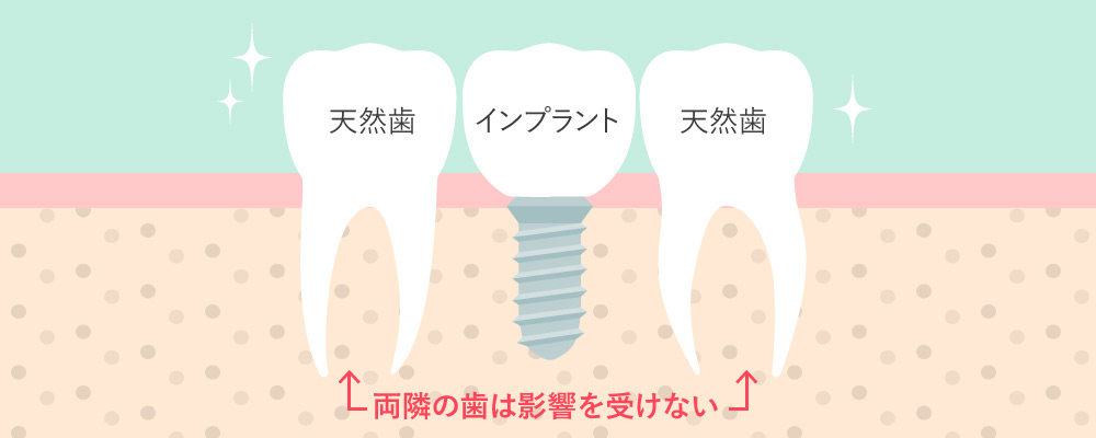 インプラントは歯を失った部分に独立して歯をたてることができるので、周囲の歯にダメージを与えません。それに対し、歯を補う他の治療法である入れ歯やブリッジでは、単独で装置を入れることができず、周囲の歯に金具をかけて力の負担がかかりすぎてしまったり、周囲の歯を大きく削らなければならない、というようなデメリットがあります。